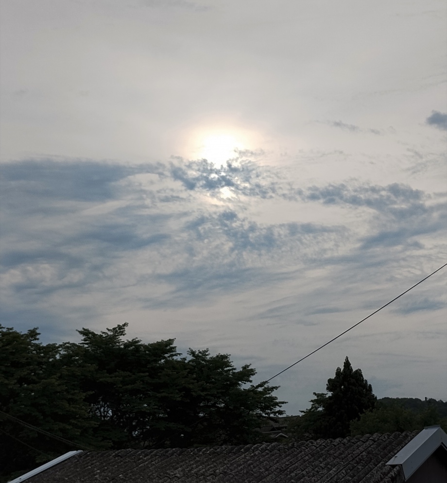 ★今朝も曇り空、雨にはならないかもですが、太陽は雲の中ですが、切れ間からは輝いていました、朝、6時25分頃の東の空、太陽は、かなり高い位置でした。朝6時25分頃の写真です。