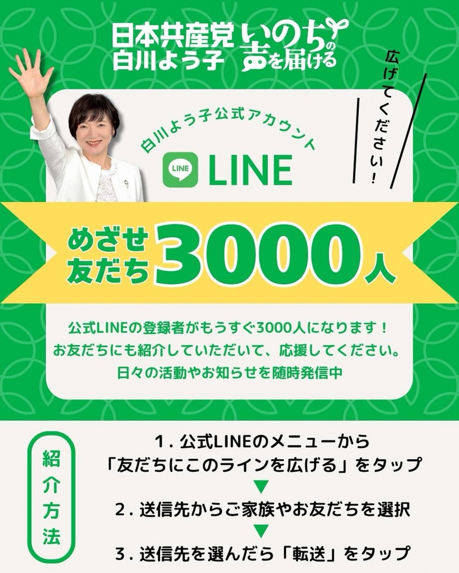★まったくの素人の判断の記事、どうなるのかも不明です、私が思っているのは、この画面が立ち上がり、白川よう子さんと、ラインでつながることができ、白川さんの活動をラインで見て、拡散というのですが、1人でも多くの友達に広げられたらいいなぁーの思いだけです、ご理解ください。