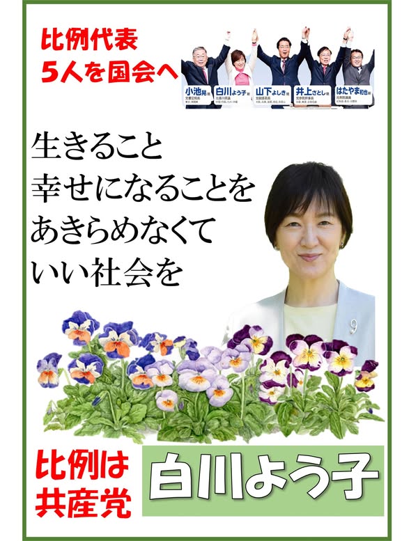 参議院選挙は七月三日(木)公示・七月二十日(日)の投開票と言われています。のこり一か月を切りました。全国比例区五人の当選へ向けて、さくらブロックの企画で先の 行動を企画しました。全市内の党と後援会の皆さんのご協力で大いなる飛躍の日にしたいと思います。お忙しいとは思いますが、是非ともご参加をお願いします。三十分だけでも、一時間だけでもご参加ください。暮らし守るために、消費税の値下げに「賛成・反対」のシール貼り活動・宣伝カーによる、私も一声のリレートーク、通行人―のビラ配布・対話活動、ご近所の要求対話活動など