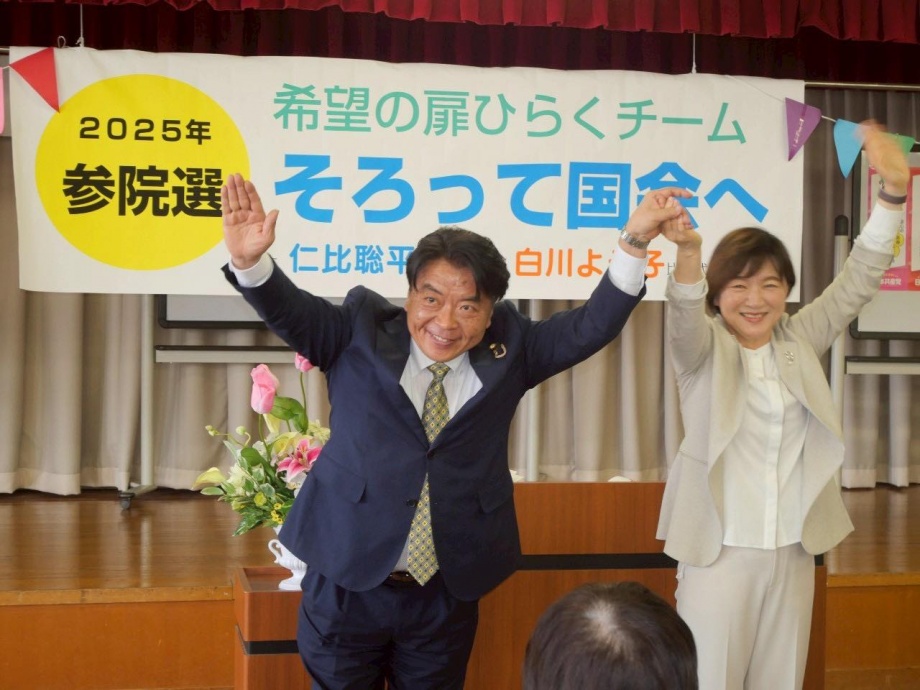 上の写真は、現職の仁比参議議員と白川さんです、仁比さんが3年前の選挙地盤、そのまんま白川さんへです。下の写真は、津山に白川さんが来た時の挨拶の様子の写真です。