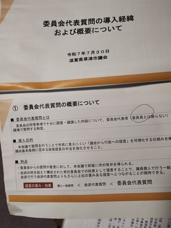 ★委員会で「意見一致で、項目を定めて、委員長が質問する」という仕組みを一つは学びました。委員会のまとめ、質問原稿など委員長の手作り、議会事務局は「手伝わない」「つくらない」ということでした。ここが、津山との絶対的なちがいですね・・・