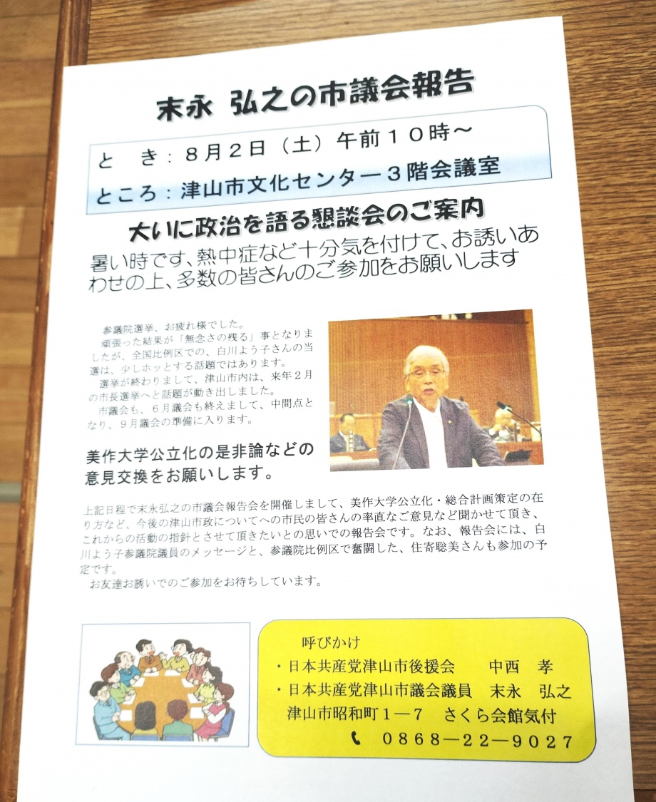 ★末永弘之の市政報告会が、明日、二日(土)の午前十時からです。津山の文化センター三階です。議員に復帰して、二年が経過しました。折り返し点を過ぎた訳です、五月に臨時市議会がありまして、正副議長など、議会の構成が変わりました。私も、多少変化です。総務分強委員は同じです。