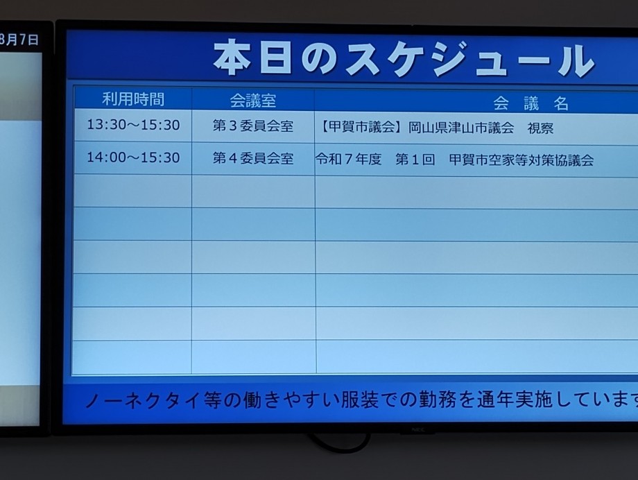 ★三重県の伊賀の忍者に並んで甲賀の忍者、その町ですが、視察は、関係ありません、滋賀県甲賀市へ行きまして、奇麗な庁舎、縦て九年目ということでしたが、議会棟も広くて、使い便利の言い作りでしたね。玄関を入って「うけつけ」がありました、業務は「民間委託」とかでした。が、小さい字で見えないかもですが、「津山市議会視察」と案内板に表示されていました‥‥まるで、国会の議員会館のような感じでしたね、
