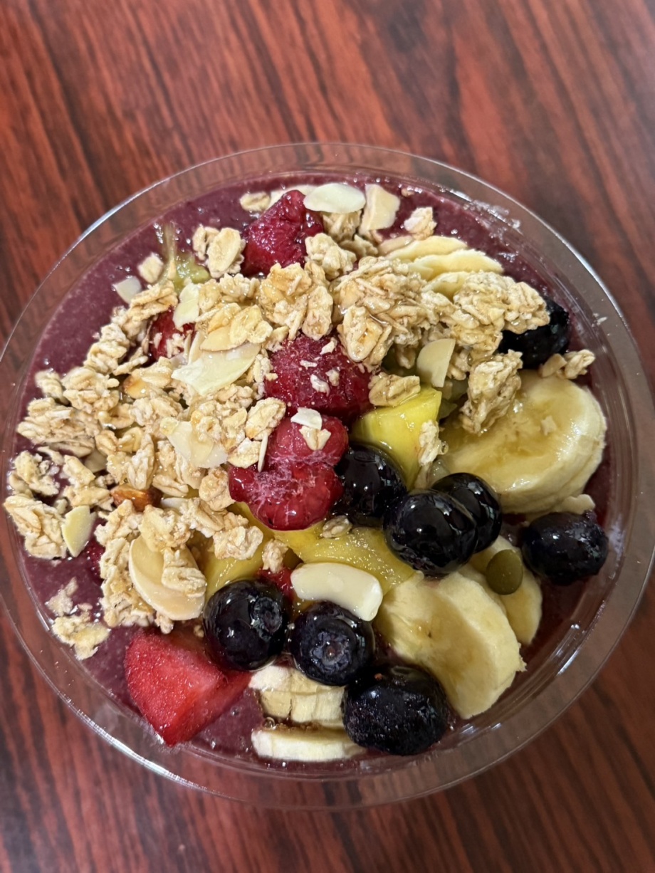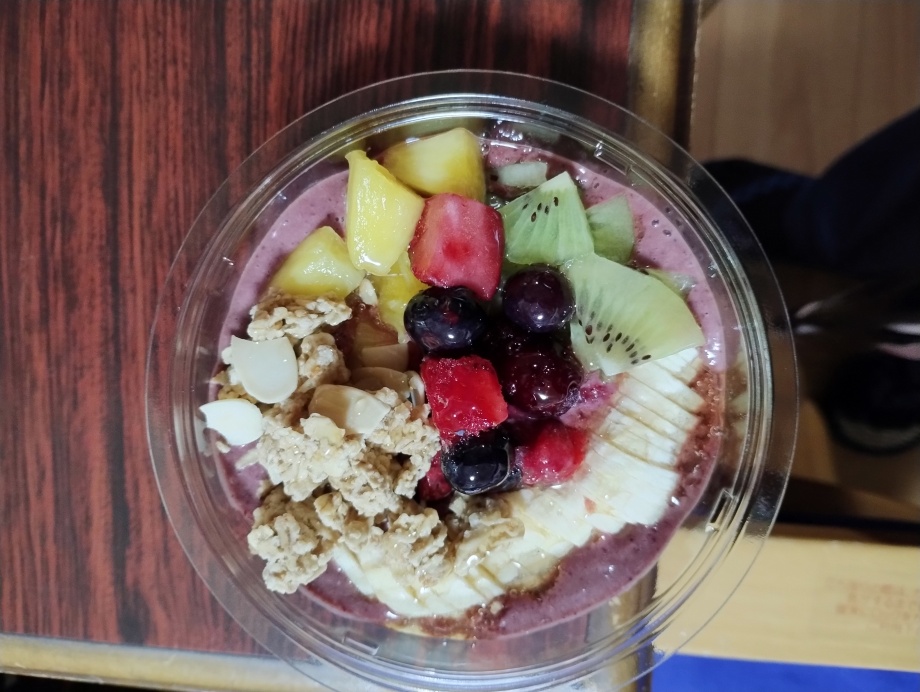 ★お嫁さんが其のかんに「アサイーボウル」というおやつを作ってくれまして、一人、一人、4回、いやいやも孫夫婦は、すこし大きめのものを創ったから、3回か、皿にももってくれまして、いただきました。