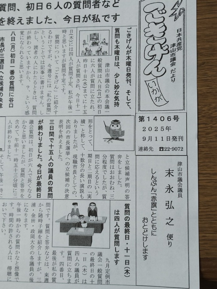 ★今日から津山市議会は、本会議における1破片質問が始まります。初日は。珍しく6人です。トップバッターが、前の議長・加島議員で「市長の未来にかける思い」を通告していますから、谷口市長の「3期目への決意」を聞き出すと思います。先日、新人の元市の職員・玉置さんが市長へ出馬表明をしましたから、どう質問して、どう答弁するか、一つの注目ですね、、来たいとか、機体出ないとかでなく、賑やかになるという事柄、一つのというより、やはり、津山にとっては、大きな「市中の話題」という点で注目です。