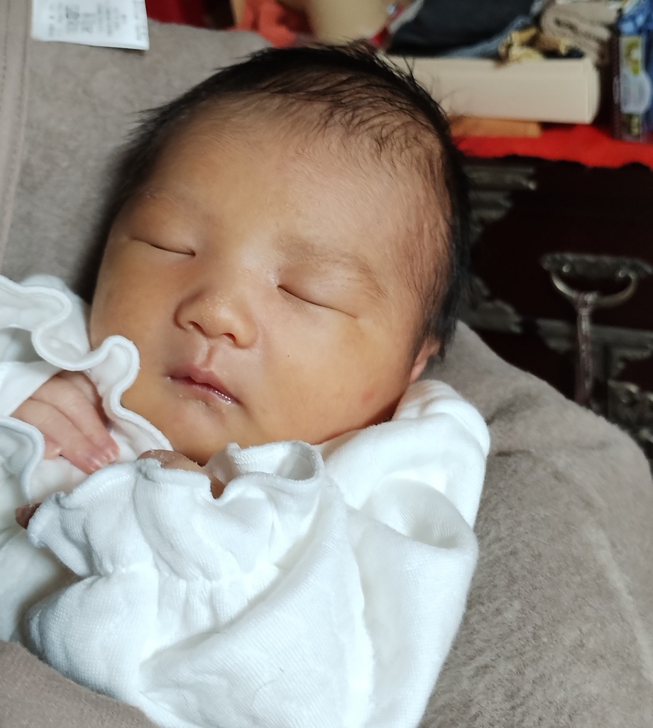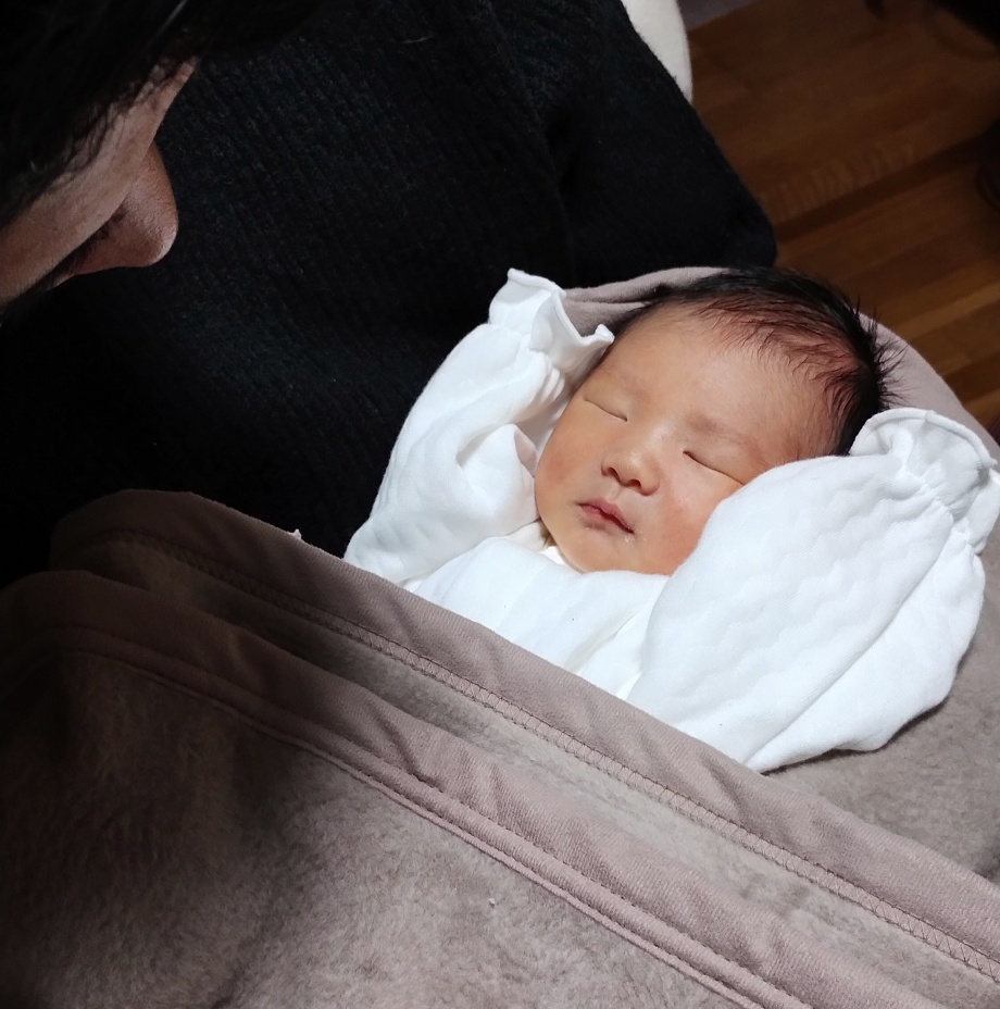 ★よく寝ていました、健康で、利口な顔つきして、口を「もぐもぐ」と動かしますが、後は、寝ていました。家人も含めて、交代で「抱っこ」しましたが、うっすらと目を開けたり、手足を伸ばしたりはしますが、鳴き声は出しませんで、寝ていましたね。