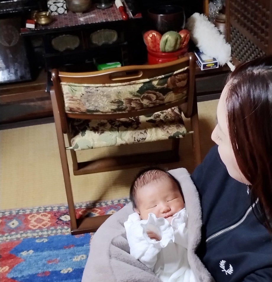 ★今朝も、曇りかな、小雨かな、あまり寒くはないですが、7時をすぎても「薄暗い」天気です。7日に生まれた「ひ孫」→その後、健(たけると命名)←が、昨日、午前10時過ぎに、タケルの自宅(我が家の前)に帰宅、すこし落ち着いてから、我が家へ、そして、先祖に挨拶という事で、仏間に連れて行きました。