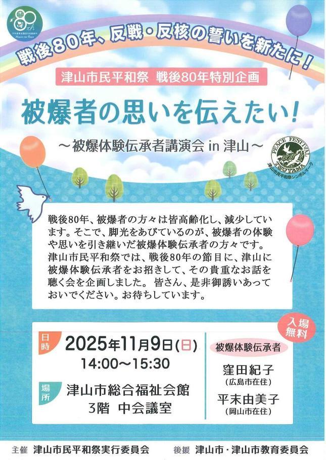 ★津山市民平和祭実行委員会(被爆二世の会 木原賢一実行委員長、末長ら副委員長)の、今年度最後の行事です。被爆80年、今、被爆者の高齢化が社会問題となりつつあり、原爆の悲惨な実態を語り継ぐために、被爆体験の話を直接聞いて、それを、伝えていくという活動「被爆体験伝承者」が本格的な活動に入っています。